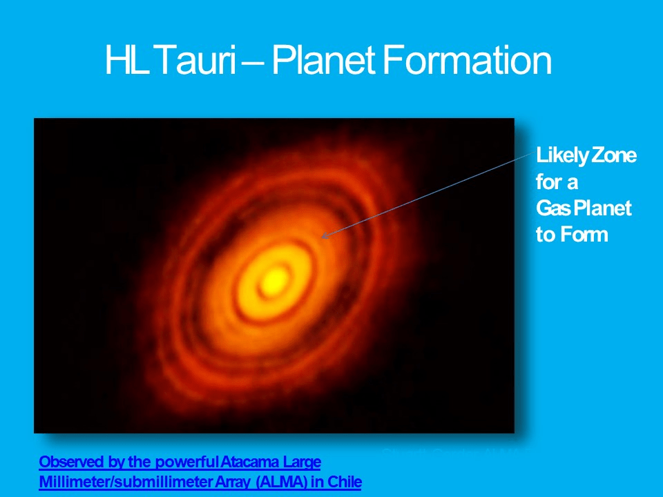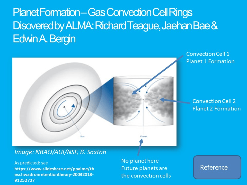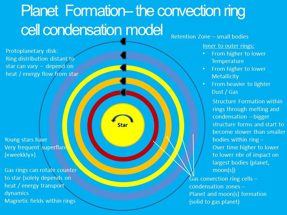 In the convection cell condensation model, the planets and small bodies form within these gas rings, while in the accretion model, the planets form in the gaps between these rings. Lately, rotating gas rings have been discovered around the star HD 163296. Link
