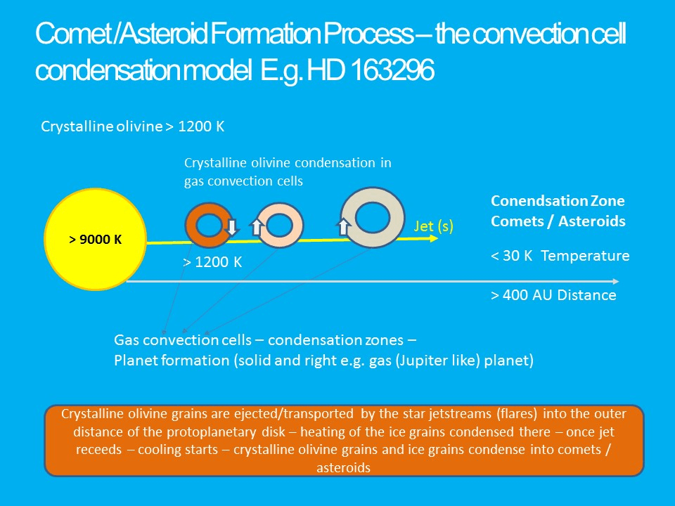 The composition of asteroids and comets was formed in different locations of the planetary disk. It is through the jets that the materials are brought together, and their final structure forms at the farthest transport point of the jet or when the jets finally stop.