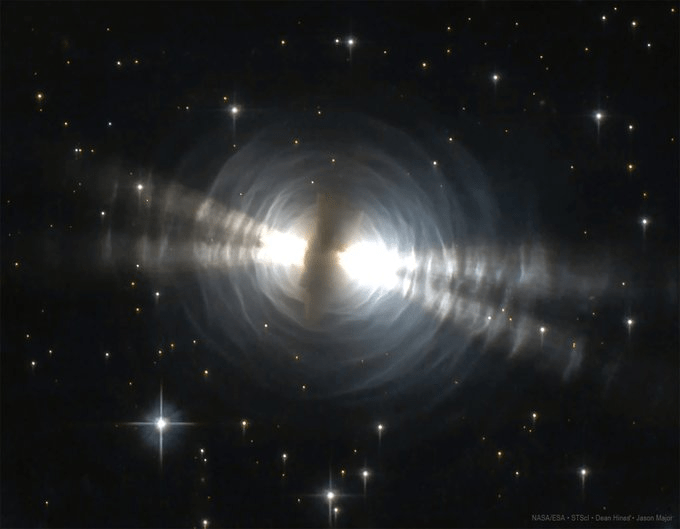 “An opaque cloud of dust and gas hides a central star that’s expelling its outer layers; beams of its light escape the cloud through holes, illuminating the layers.”