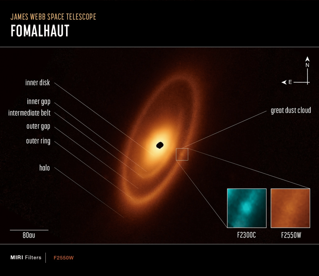 Formalhaut: Three Dust rings, but no planets between the dust rings. Image: nasa, esa, csa, a. pagan (stsci), a. gáspár (university of arizona) https://www.nature.com/articles/s41550-023-01962-6 and https://www.watson.ch/wissen/astronomie/889686736-james-webb-teleskop-entdeckt-drei-asteroidenguertel-um-stern-fomalhaut